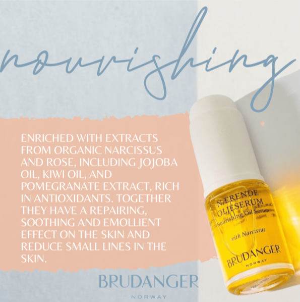 Nærende oljeserum er beriket med organiske ekstrakter fra narcissus og rose, som er kjent for sine reparerende, beroligende og mykgjørende effekter på huden. Jojobaolje balanserer både tørr og fet hud, mens arganolje har en fuktighetsgivende og pleiende effekt på huden. Hibiskusolje er spesielt rik på antioksidanter og kalles naturens botox. Kiwifrøolje tilfører huden omega-3 fettsyrer og bidrar til å øke hudens elastisitet. Granatepleekstrakt virker fuktighetsgivende, beskyttende og beroligende på huden og har et høyt innhold av antioksidanter. Roseolje og neroliolje har en pleiende og celleregenererende effekt på huden. Sammen virker de reparerende, beroligende og mykgjørende på huden og reduserer fine linjer i huden. Nærende oljeserum har en ren og delikat planteduft.